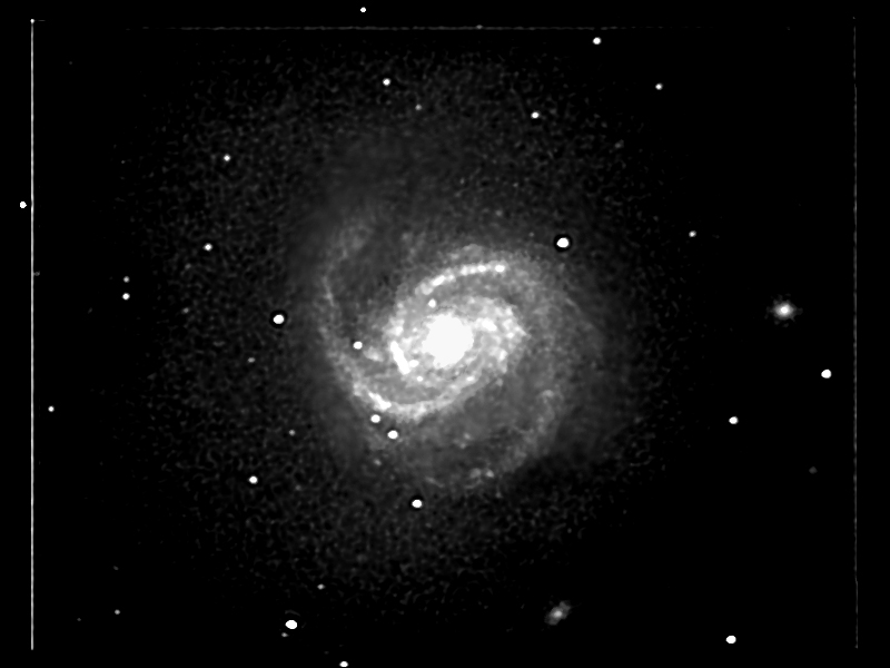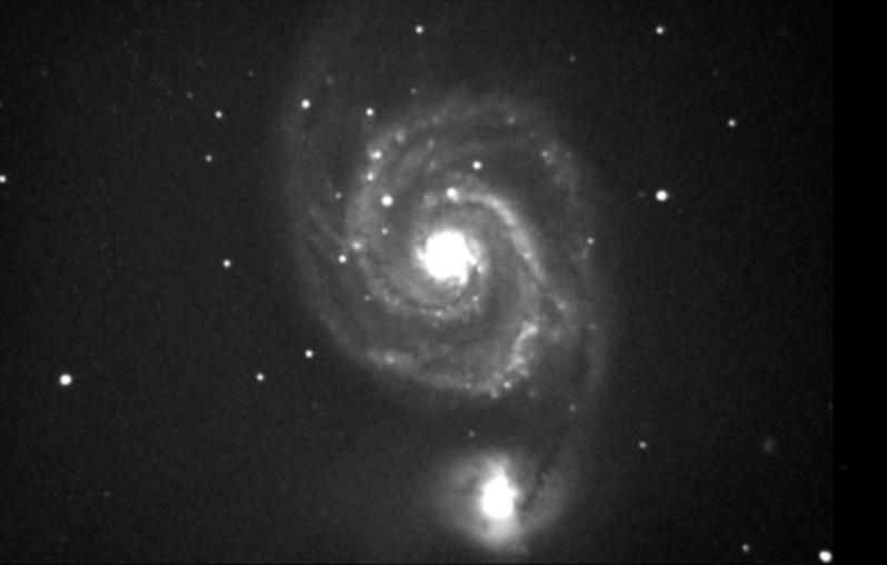 This is M51 the famous Whirlpool galaxy in Canes Venatici. This bright galaxy is about 37 million light years distant, and color photos show many bright pink areas within the numerous spiral arms. This object is thought actually to be two galaxies, the larger central bright disk and its gravitationally bound partner at the lower edge of the image. This luminance only image (17 exposures) was taken with the 14" Meade LX200GPS in July 2005.