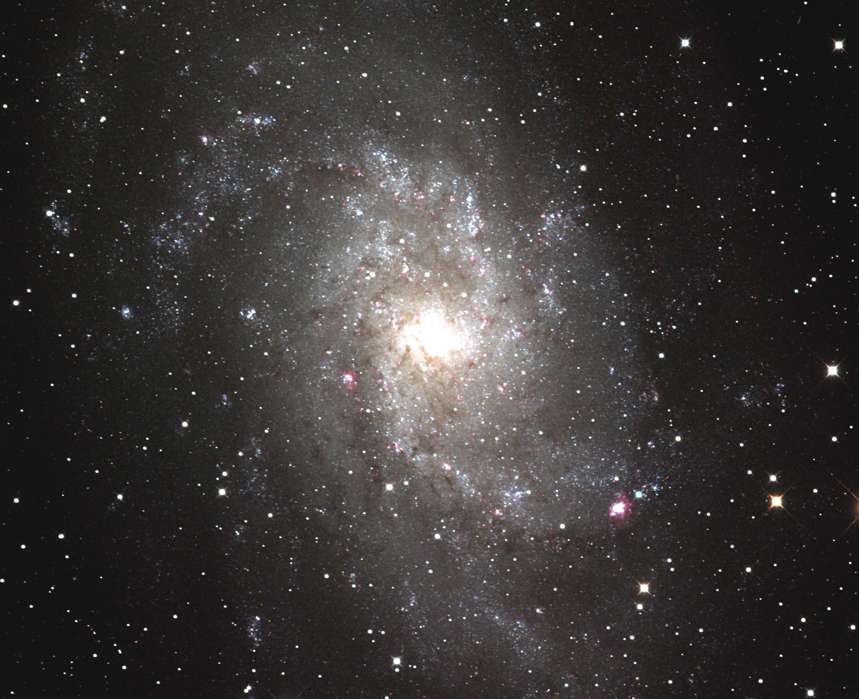 This image is of the spiral galaxy M33 (Triangulum or Pinwheel Galaxy), one of the local group of galaxies. It was taken in September, 2008, from New Mexico Skies using the Takahashi FRC-300 telescope and an SBIG STL-11000M camera. A total of 1.5 Hrs exposure were required to yield this LRGB image.