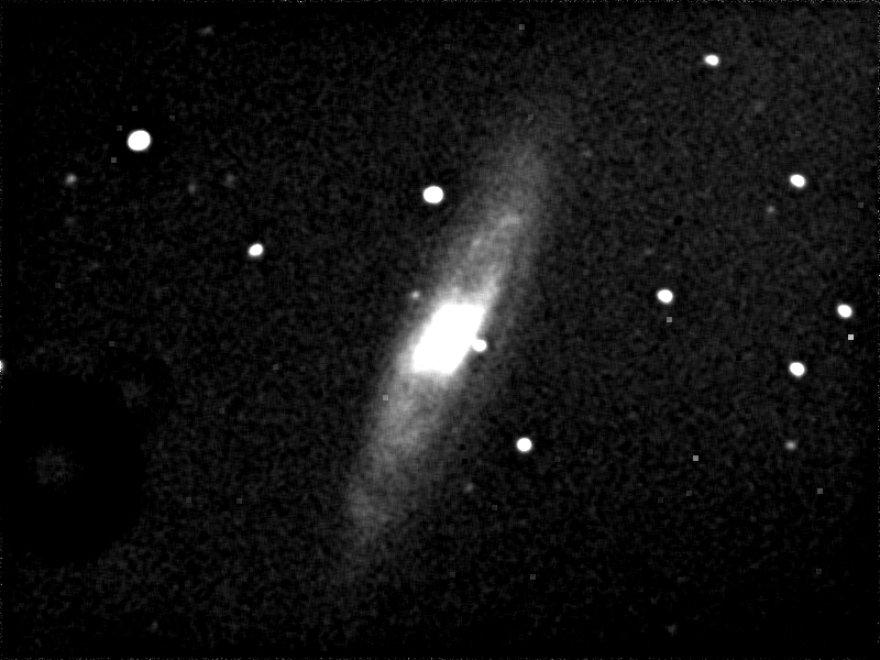 This is the edge-on spiral galaxy M65, one of the Leo triplet. It's visual brightness is only 9.3, and is about 35 million light years distant. This luminance only photo was taken with the 10" Meade LX200GPS at Morristown, NJ.
