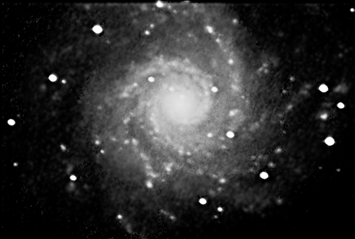 This is the symmetrical face-on spiral galaxy (type Sc) M74 in Pisces. This magnitude 9.4 galaxy is about 35 million light years distant. This luminance only image (36 exposures of 30-45 sec each) was taken with the 24" R-C telescope at Star Hill, New Mexico (f/8) in October 2004.