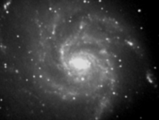 This is another face-on spiral galaxy M101 in Ursa Major. This galaxy is fairly close at about 24 +/- 2 million light years distant, and is of about magnitude 10. This luminance only photo was taken with the 14" Meade LX200GPS (f/6.3) at Morristown, NJ.