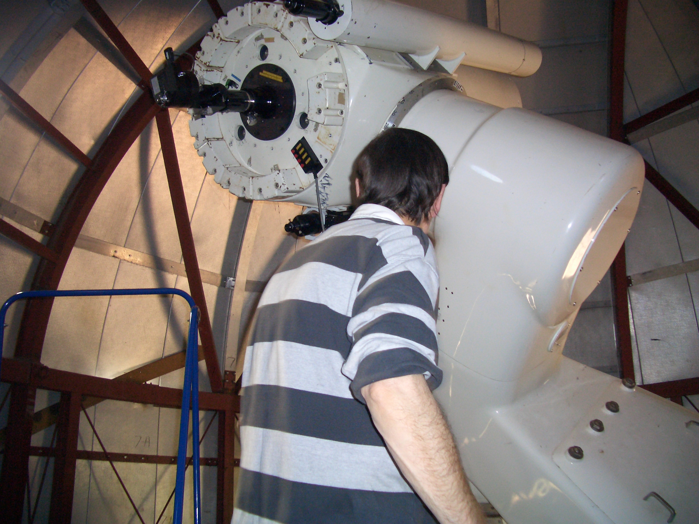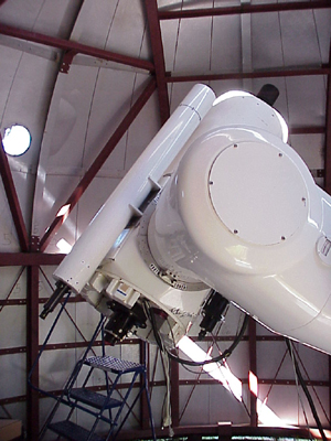Pete climbs back down the ladder after attaching the imager and flip-mirror. Note the 6" refractor tube attached to the side of the main telescope tube- this piggybacked 'scope serves as a general finder, or for secondary viewing. Also note the control paddle attached to the back of the telescope, which allows the operator to make minor adjustments to the pointing for finding and centering the object in the field of view. When the telescope is pointing in certain orientations the eyepiece may be ten feet above the dome floor, requiring the ladder to reach.