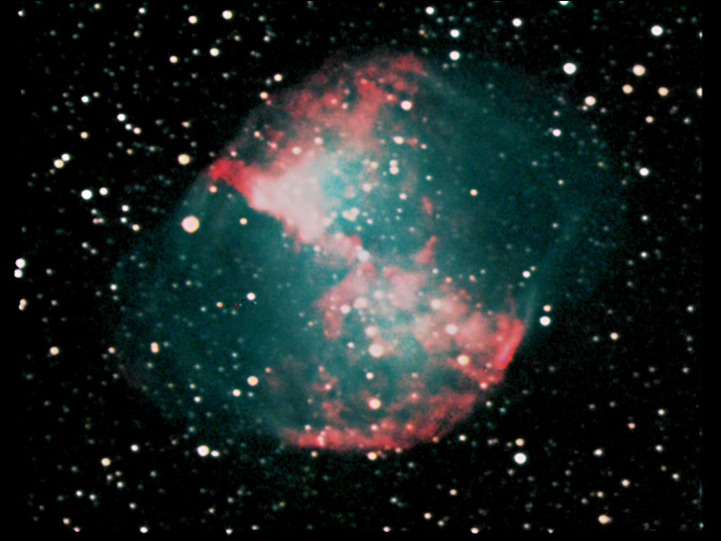 M27, the Dumbbell Nebula in Vulpecula. This bright and colorful nebula is only about 1200 light years distant and so a fair amount of detail is visible. If you look carefully, you will see that the object is probably a sphere formed by expanding shell of gases being ejected by the bluish star in the very center. Taken at the Star Hill Inn in October, 2004, with the 24" R-C telescope (f/8).