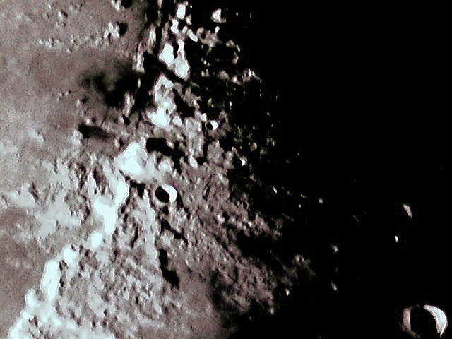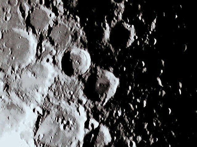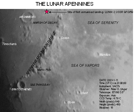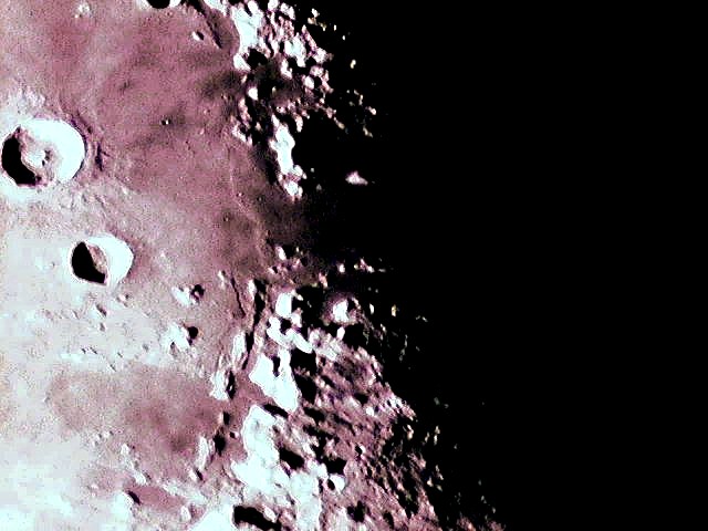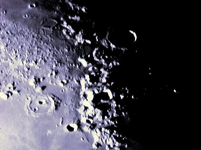 Notes on these lunar images. The field of view is ca. 355 X 266 miles, calculated from the telescope focal length and CCD chip field of view. Each pixel represents about 0.58 miles on the lunar surface. Images acquired with SAC7b camera. Meade LX-200GPS (10") or ETX-90 telescopes used for these pictures.